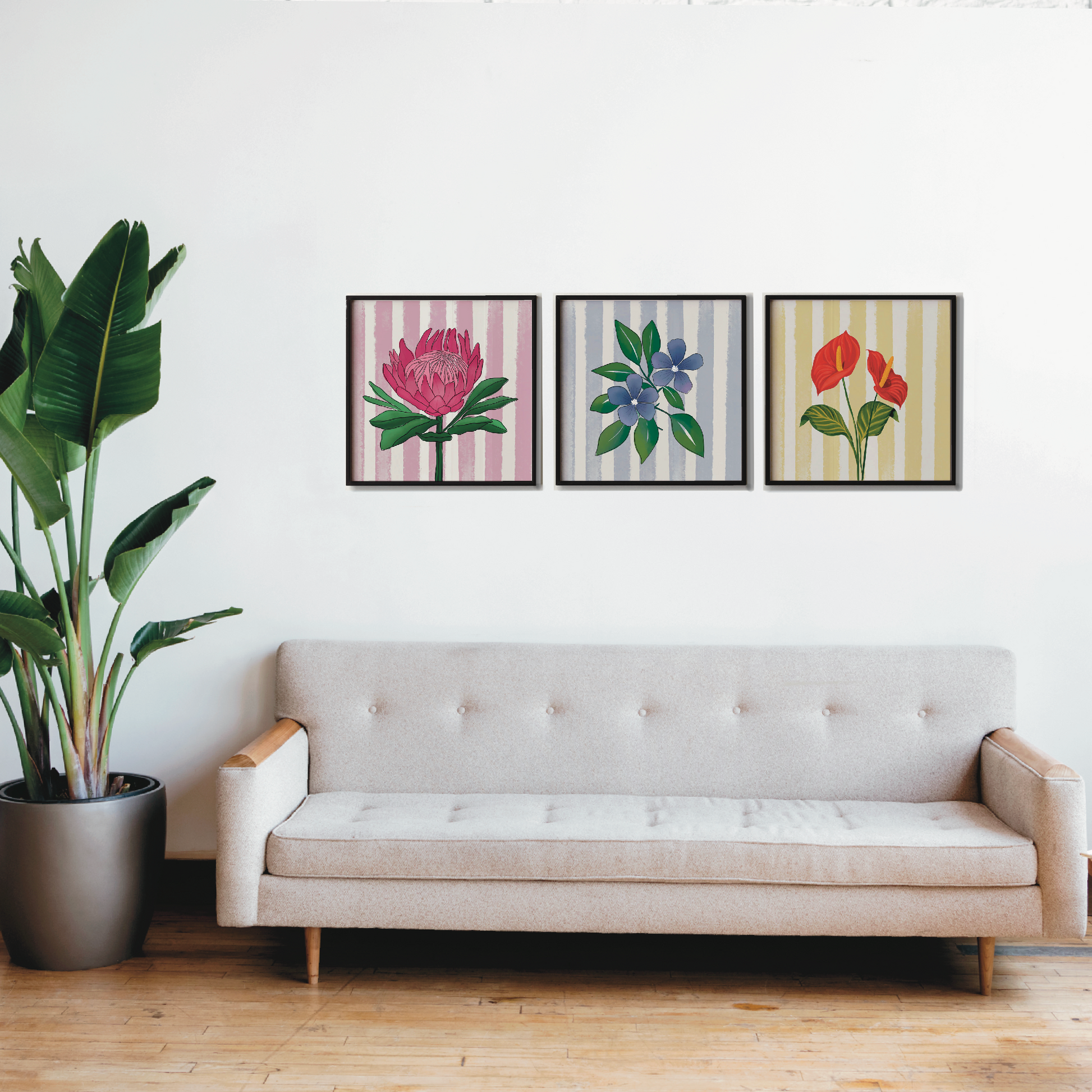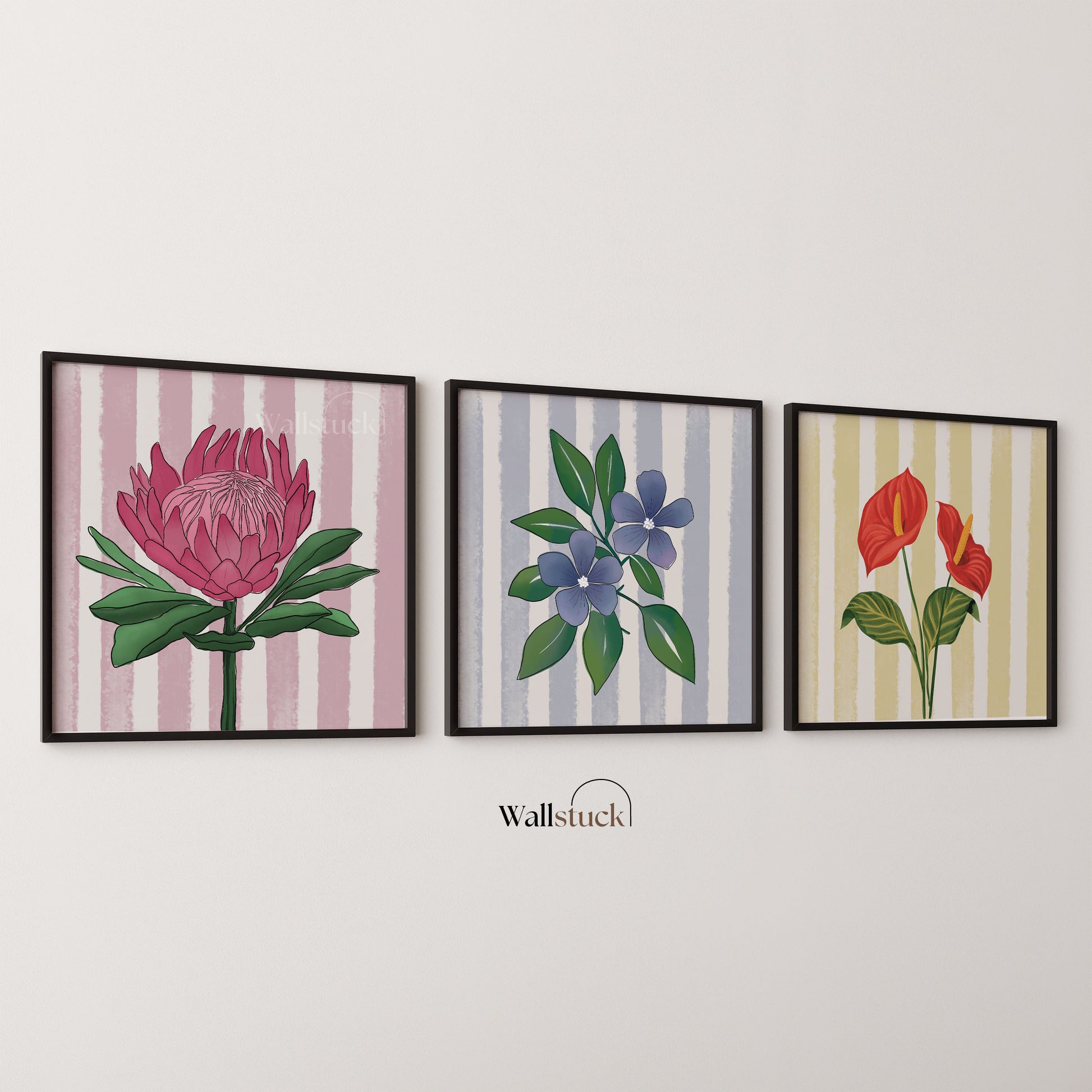 The soft pink striped background adds a playful yet elegant contrast to the flower’s layered texture, blending modern design with botanical beauty. Ideal for bedrooms, hallways, or creative spaces, this piece brings color, energy, and meaning to your walls.