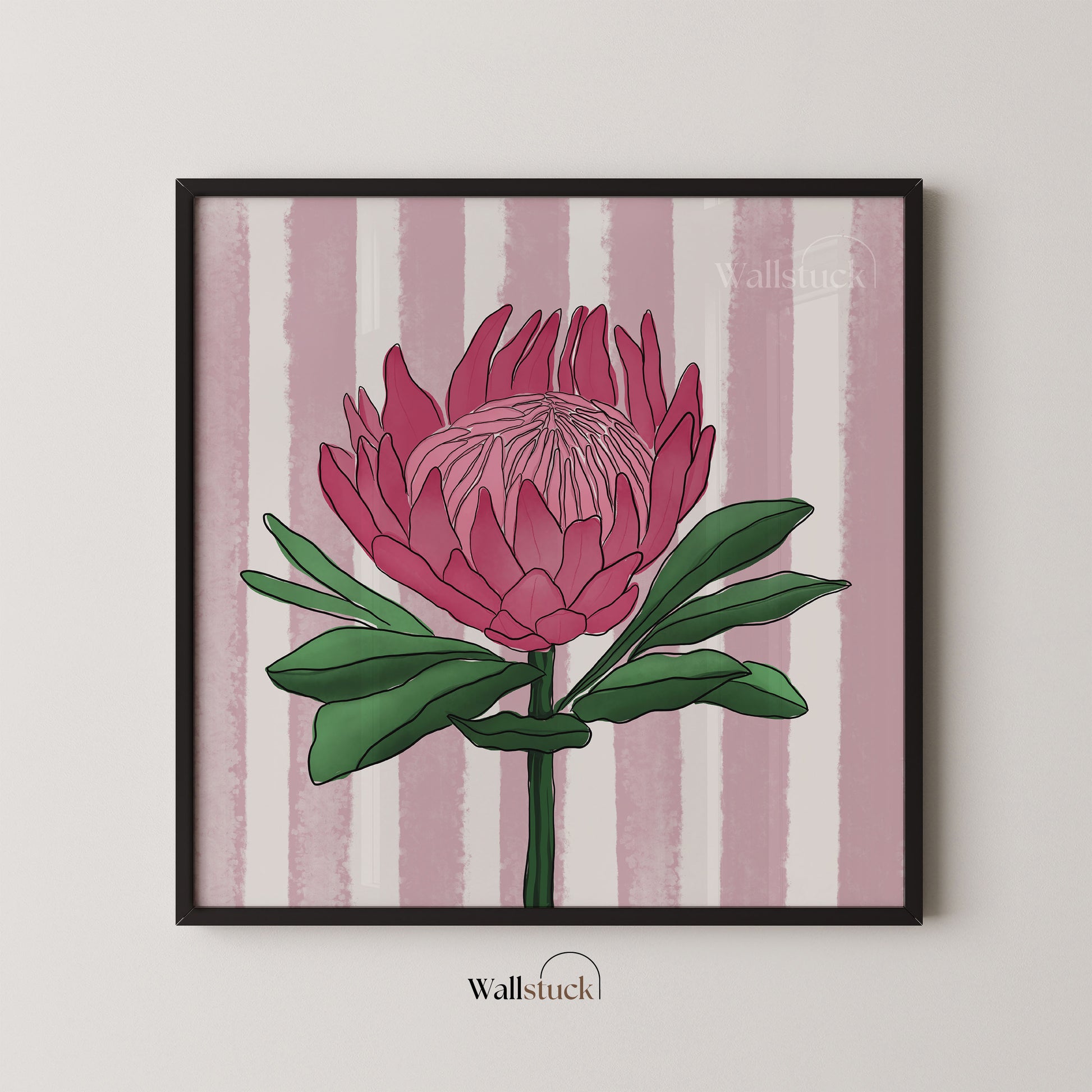 Celebrate strength and uniqueness with Protea Bloom, a bold floral art print featuring the majestic King Protea. With its dramatic pink petals and vibrant green leaves, the King Protea symbolizes transformation and courage, making it a striking focal point for any space.