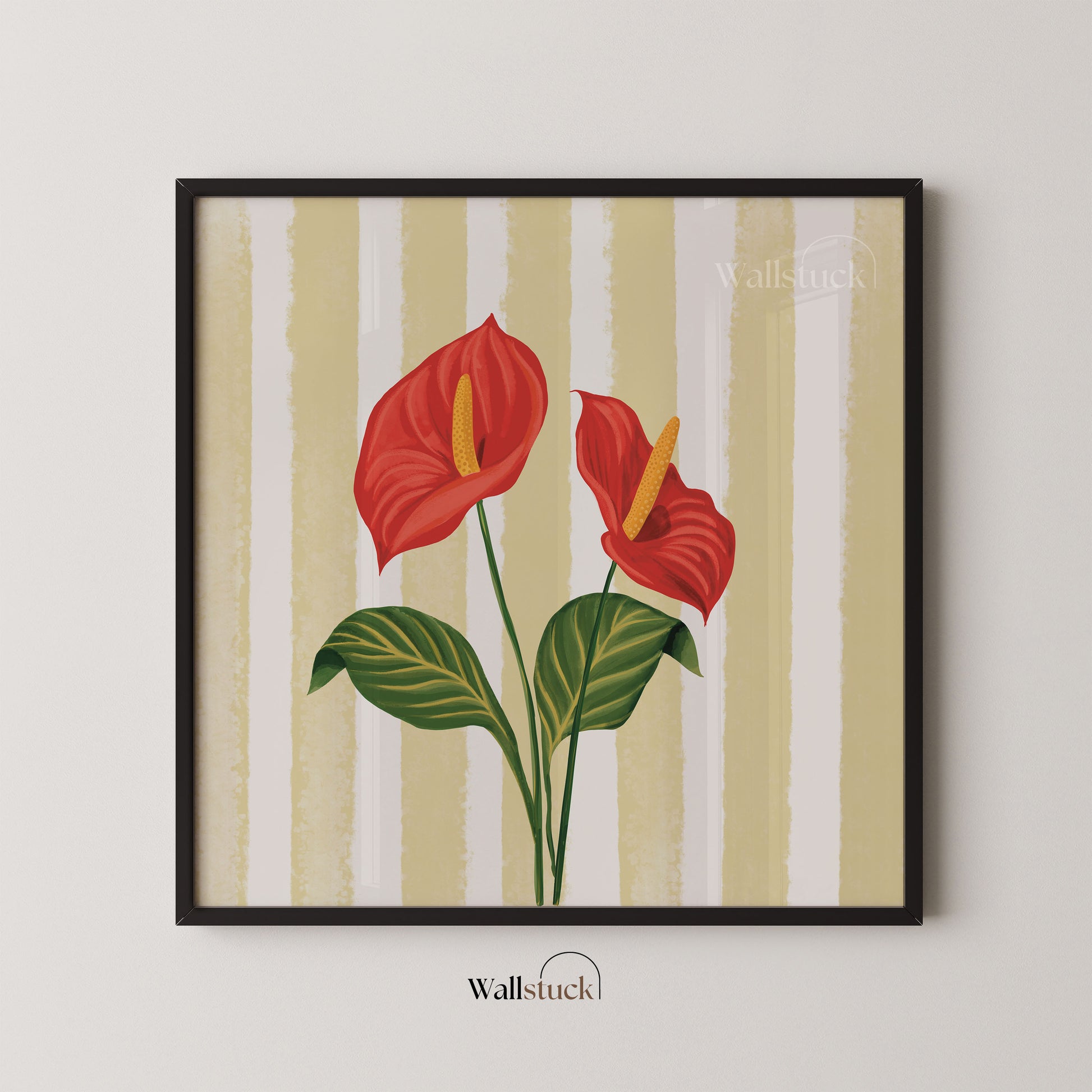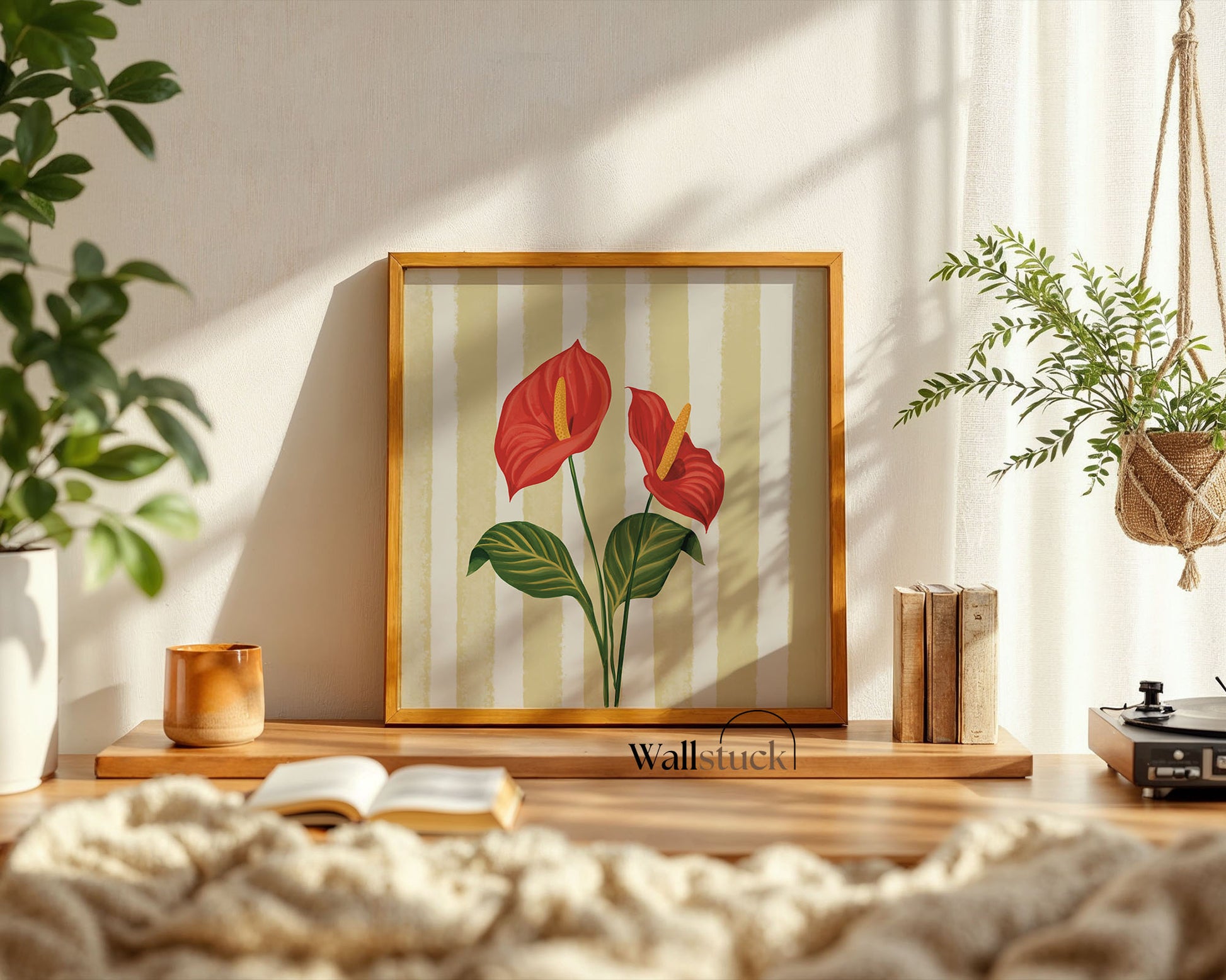 Bring a touch of bold beauty to your space with this vibrant art print featuring the striking Anthurium, also known as the Flamingo Flower. With its deep red petals, golden spadix, and lush green leaves set against a soft beige striped background, this piece adds both elegance and energy to any wall.