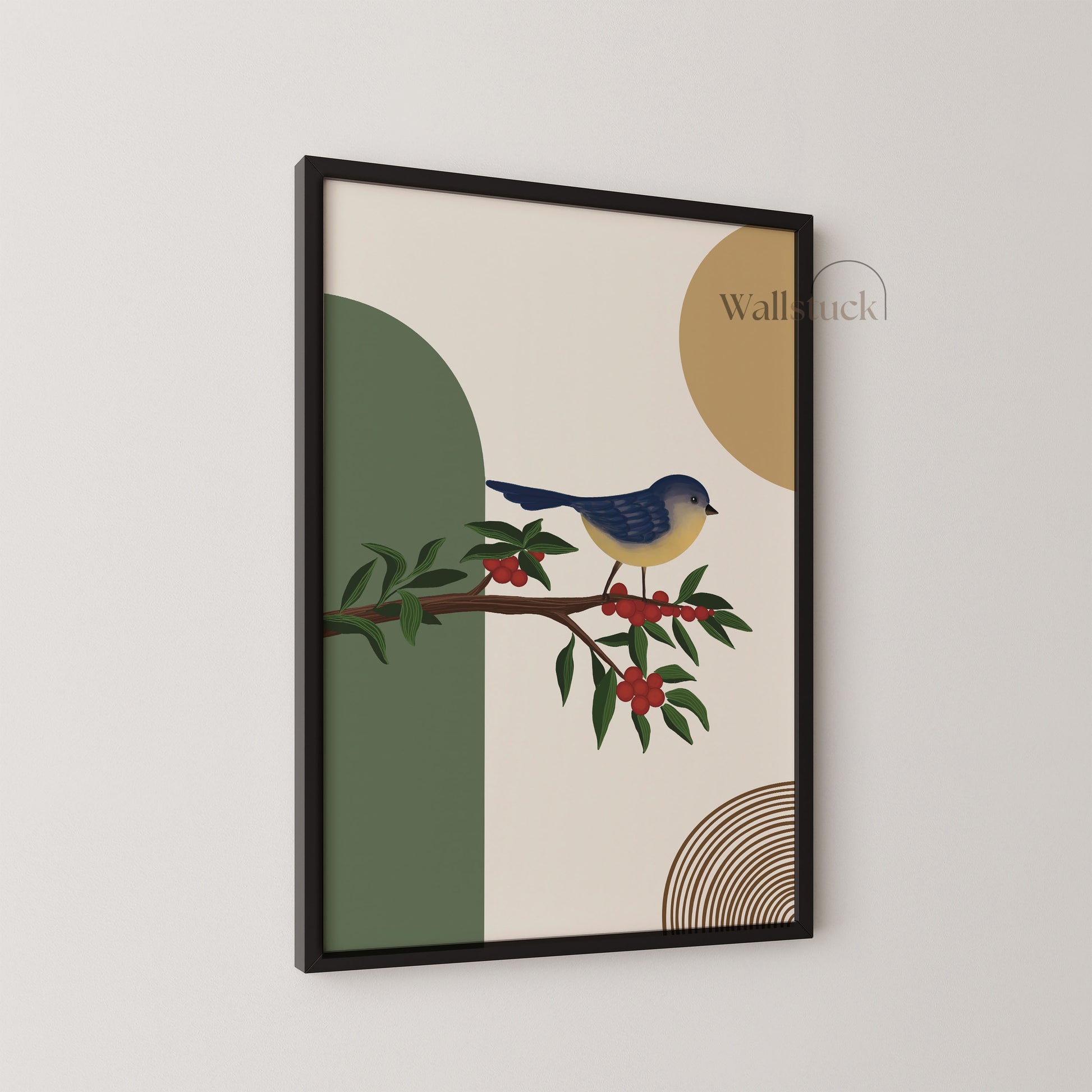 Add a peaceful touch of nature to your space with this beautifully illustrated art print featuring a charming bluebird perched on a branch with red berries. The modern geometric background in warm earthy tones and forest green gives it a contemporary twist—making it a perfect fit for both minimal and eclectic interiors.