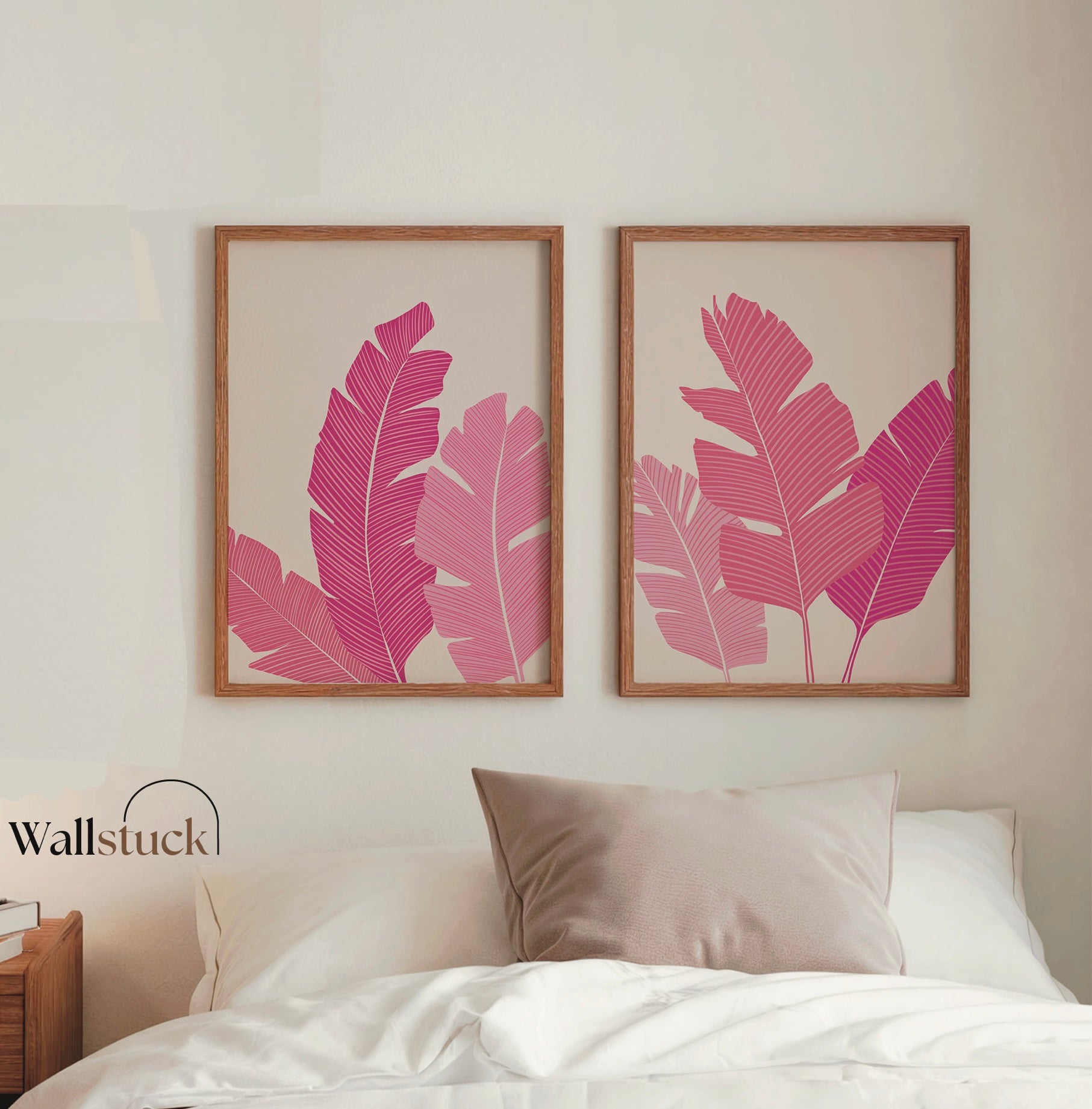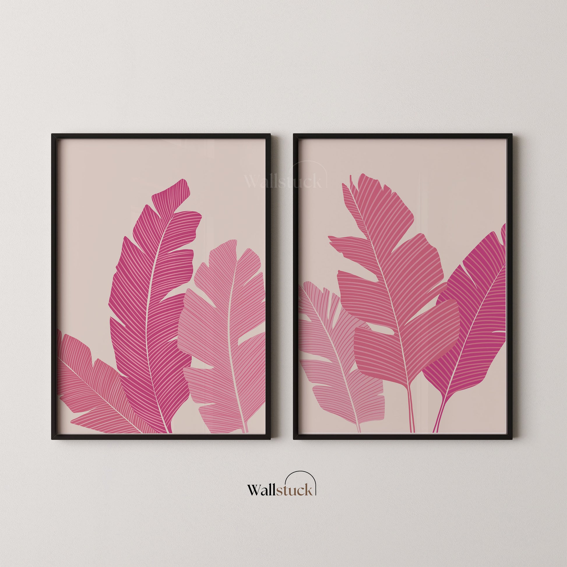 Add a vibrant tropical touch to your space with this modern botanical art print set, featuring large, stylized banana leaves in rich shades of magenta and pink. The minimal, flat design contrasts beautifully against a soft blush background, creating a bold yet soothing composition.